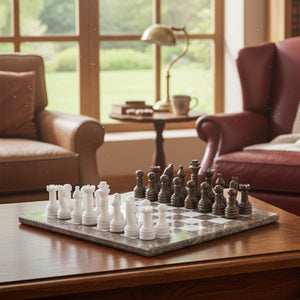 A handcrafted chess set made from premium sand dune and white marble. Elegant, durable, and timeless — designed for both play and display.